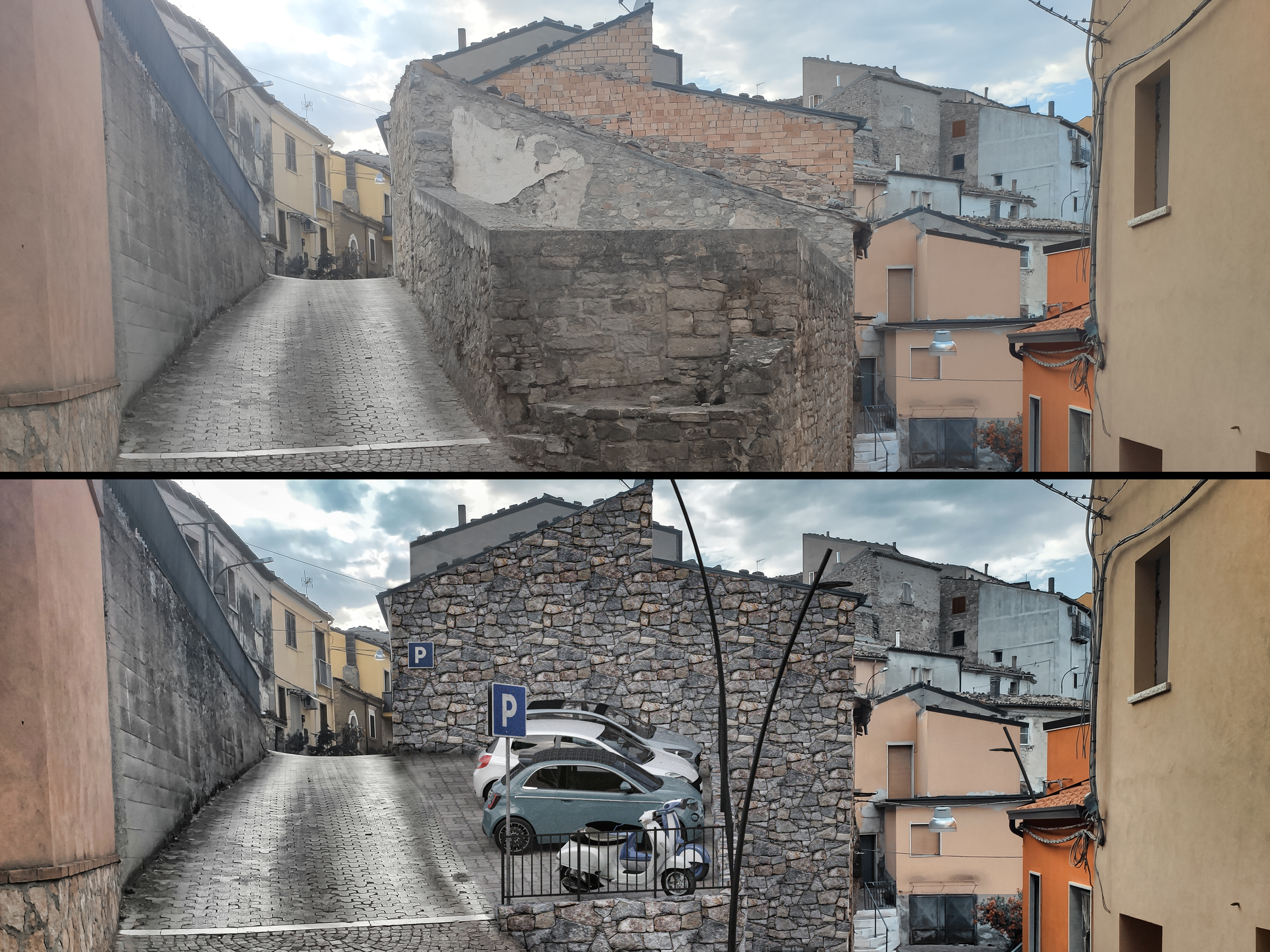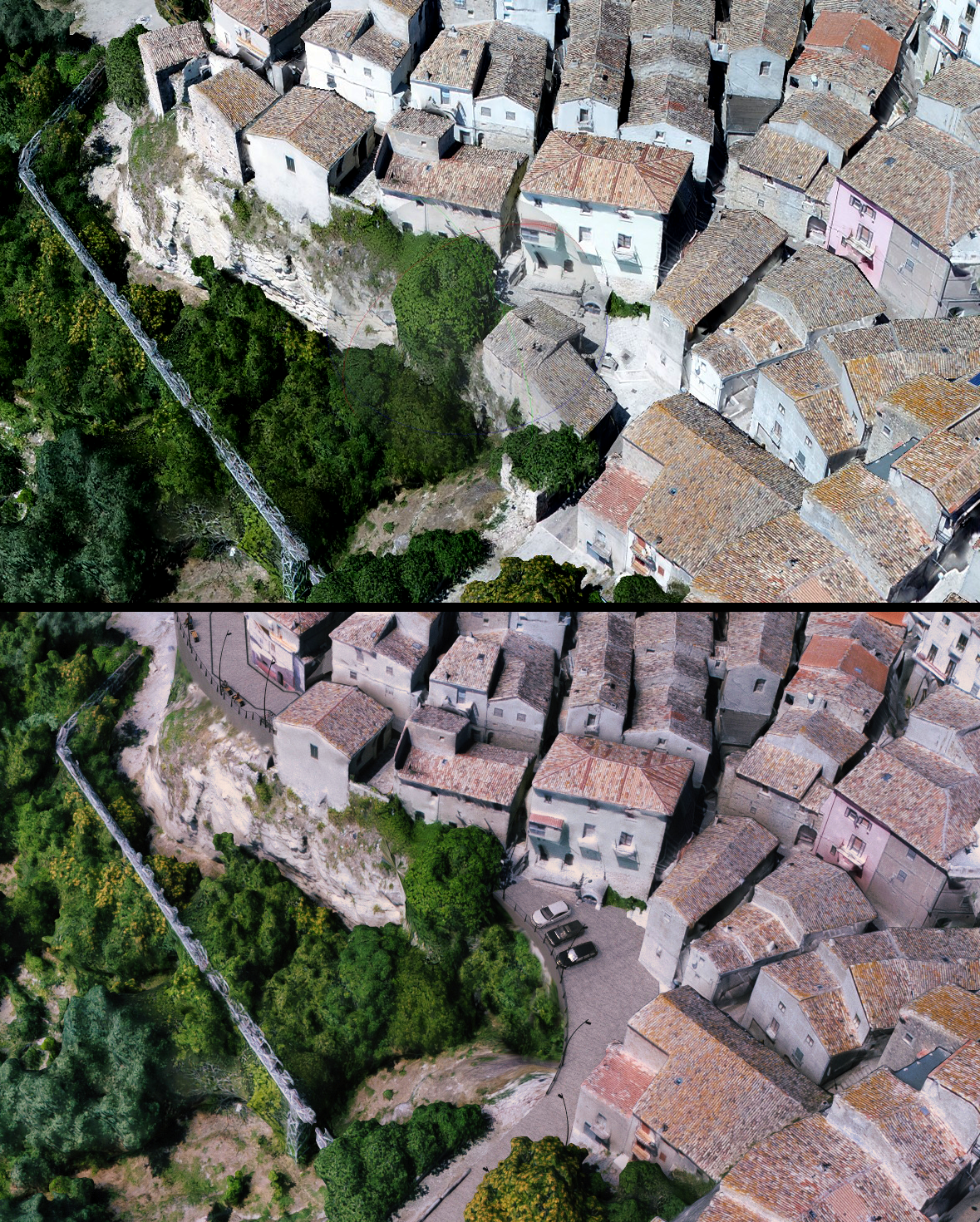 Comune di Tufara, CB. Interventi di consolidamento e sistemazione dei dissesti idrogeologici. Lo studio presenta un progetto globale per modernizzare il comune. Lo studio fornisce immagini di riferimento e foto aeree per definire l’ambiente tridimensionale. Oltre alle planimetrie, descrizione del progetto e specifiche tecnico/estetiche.